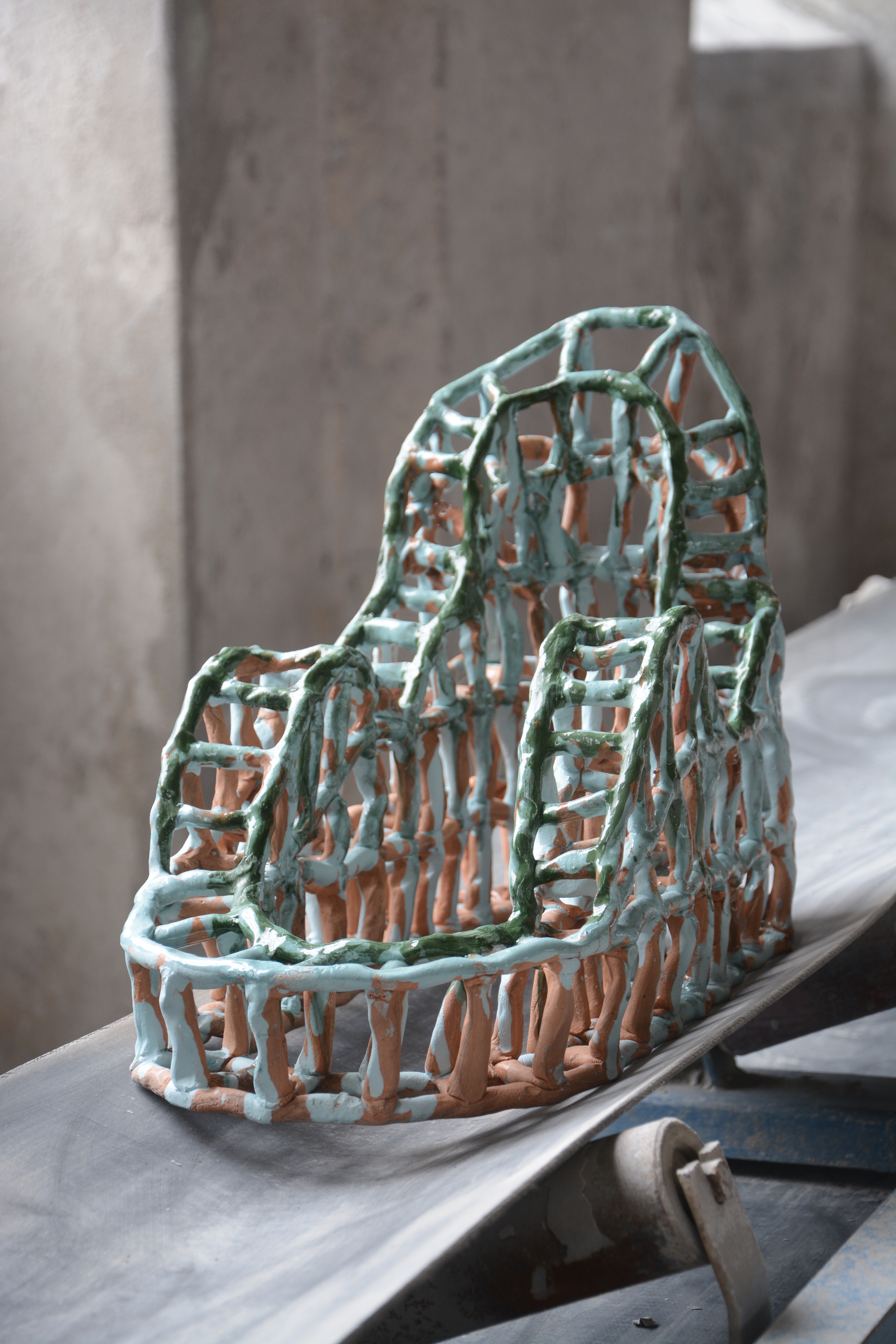 ”Genom att besöka lämningarna av den gamla kaolingruvan på Ivön där leran bröts och få ta del av de historiska fragmenten och spåren i naturen av mänsklig aktivitet så påverkades mitt konstnärliga arbete. Ett av de första föremål som möter besökaren i Iföverkens Industrimuseum är en 2500 år gammal gravurna. Jag förbryllas över länken till de tidigare generationer som format leran just på den här platsen och att det pågått i så många generationer. Att bruket fanns innan bygden präglar relationen till människorna som verkat och levt här.